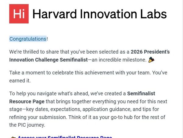 Incredibly grateful and humbled to be named a 2026 Semifinalist in Harvard’s President’s Innovation Challenge (PIC) — Harvard’s flagship, university-wide program that supports and funds high-impact ventures tackling real-world problems 🏆🏆